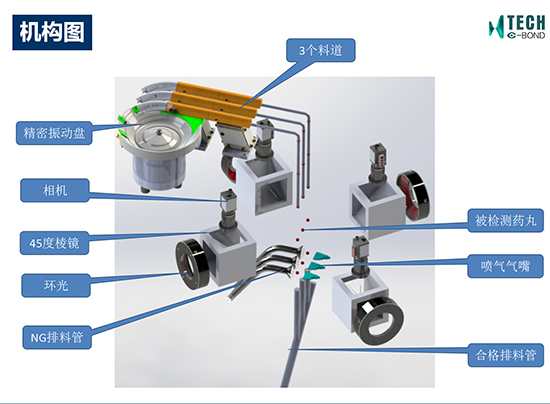 在藥粒檢測過程中,需進行藥粒上白點、藥粒圓不圓、藥粒的粘連、藥粒的色澤正確等功能,檢測完成后輸出OK、NG信號,在排廢位進行剔除動作。系統采用進口工業相機快速獲取產品圖像,通過圖像識別、分析和計算,輸出檢測信號。 二、【藥粒檢測系統結構圖】