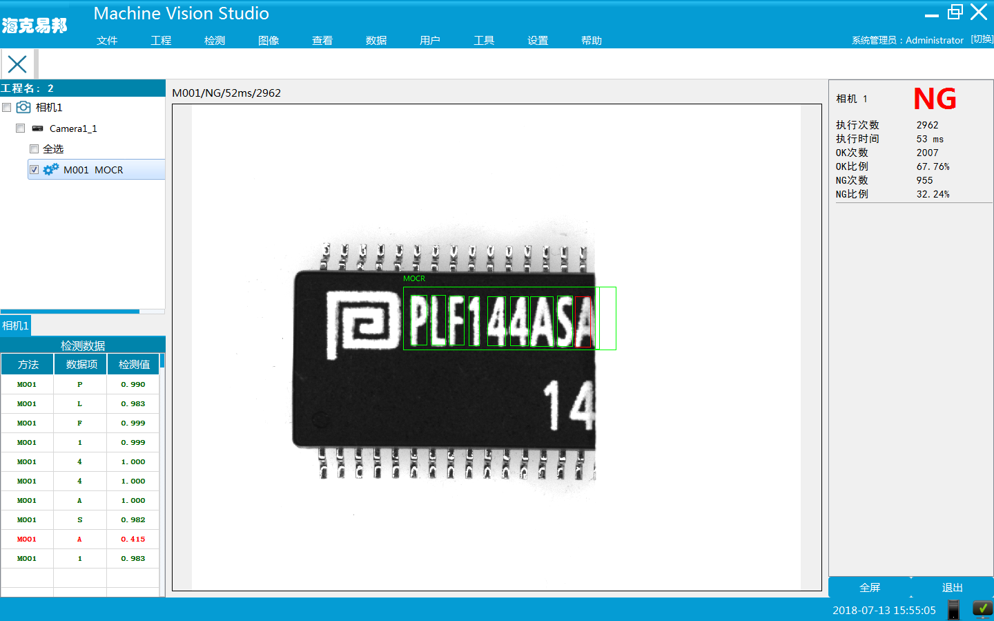 西安海克易邦光電科技有限公司基于機器視覺圖像處理技術研發的字符檢測系統,具有高精度、高速、多樣品化的特點。系統主要模塊有:圖像處理模塊、控制模塊。根據用戶需求,樣品移動到檢測位,觸發相機并及時對視覺系統輸出檢測信號,從而完成檢測功能。產品到位后,系統識別字符信息;將識別到的信息與字庫信息進行匹配,且與設置字符對比是否一致;信息一致系統輸出OK信號,信息不一致時系統輸出NG信號。