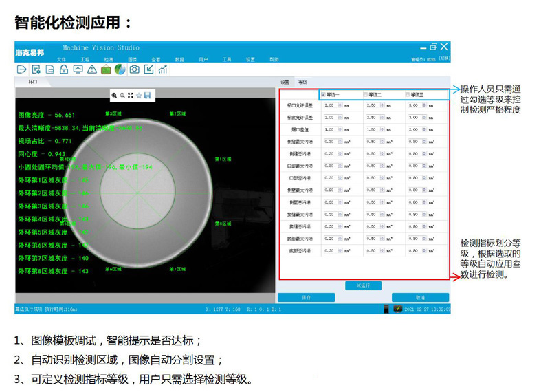 1.產(chǎn)品自動定位:檢測時實(shí)時定位商標(biāo)特定圖案,給出當(dāng)前位置的初始位置的偏差,檢測區(qū)域位置自動補(bǔ)償,實(shí)現(xiàn)產(chǎn)品自動定位功能。